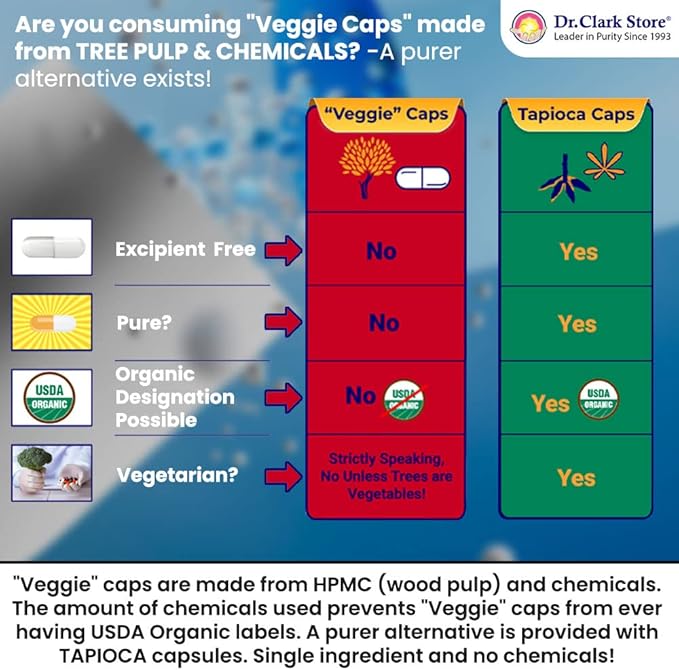 - Clean Tapioca Capsules- Made with Pure, High Quality, TAPIOCA capsules. Encapsulated in the Purest Possible Capsules we don't use 'HPMC' capsules (called 'Veggie Caps') since those contain too many potentially hazardous chemicals