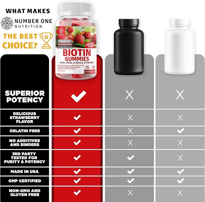 Number One Nutrition N1N Premium Biotin Gummies 5000mcg [High Potency, 90 Gummies] for Healthy Hair, Skin and Nails for Adults and Kids, Vegan, Non-GMO, Pectin Based