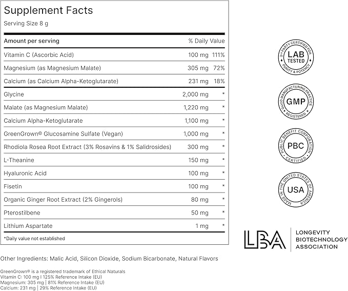 - NATURE-BASED: The ingredients we choose are found in food or human biology, and contains high-quality ingredients at the optimal dosages including magnesium, vitamin C, ginger, hyaluronic acid, L-Theanine, glycine, rhodiola rosea, fisetin, glucosamine sulfate, pterostilbene, calcium alpha-ketoglutarate, and magnesium malate to tackle multiple mechanisms of aging. NOVOS Core contains zero calories and sugar, is all-natural, vegan, and gluten-free, 3rd party tested and manufactured in the USA.