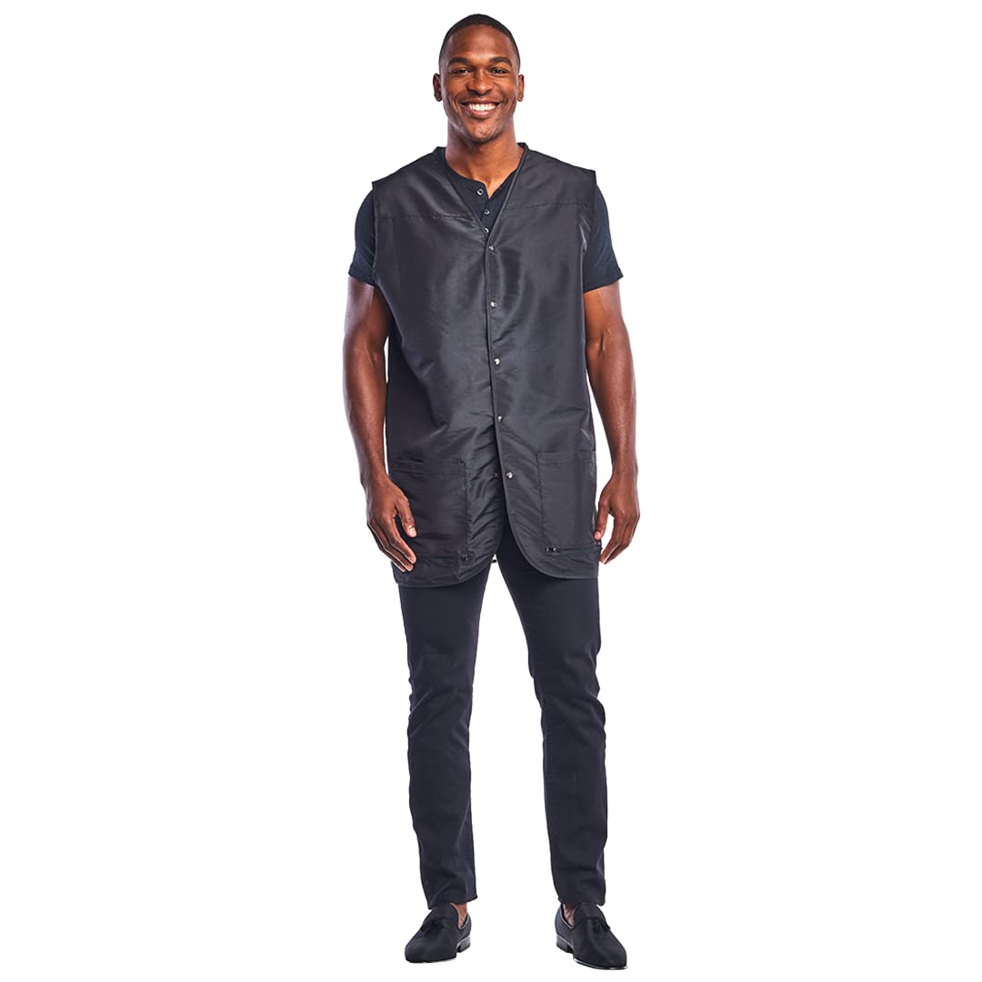 This Men'S Barber Vest From Betty Dain Features A Unique Breathable Stretch Mesh Back Panel So You Can Stay Cool While You Cut, Color, And Style. It Also Offers A Snap Front Closure And Two Lower Pockets That Zip To Keep Hair And Debris Out. The Fabric Is A Lightweight Satin Finish Nylon/Poly Blend That Is Water Resistant And Easy To Clean. Machine Washable. Designed And Manufactured By Betty Dain, Which Has Listened To The Needs Of The Beauty Industry And Created High-Quality Solutions For Over 60 Years. Note: Sizes Run Slightly Large To Accommodate An Undershirt.