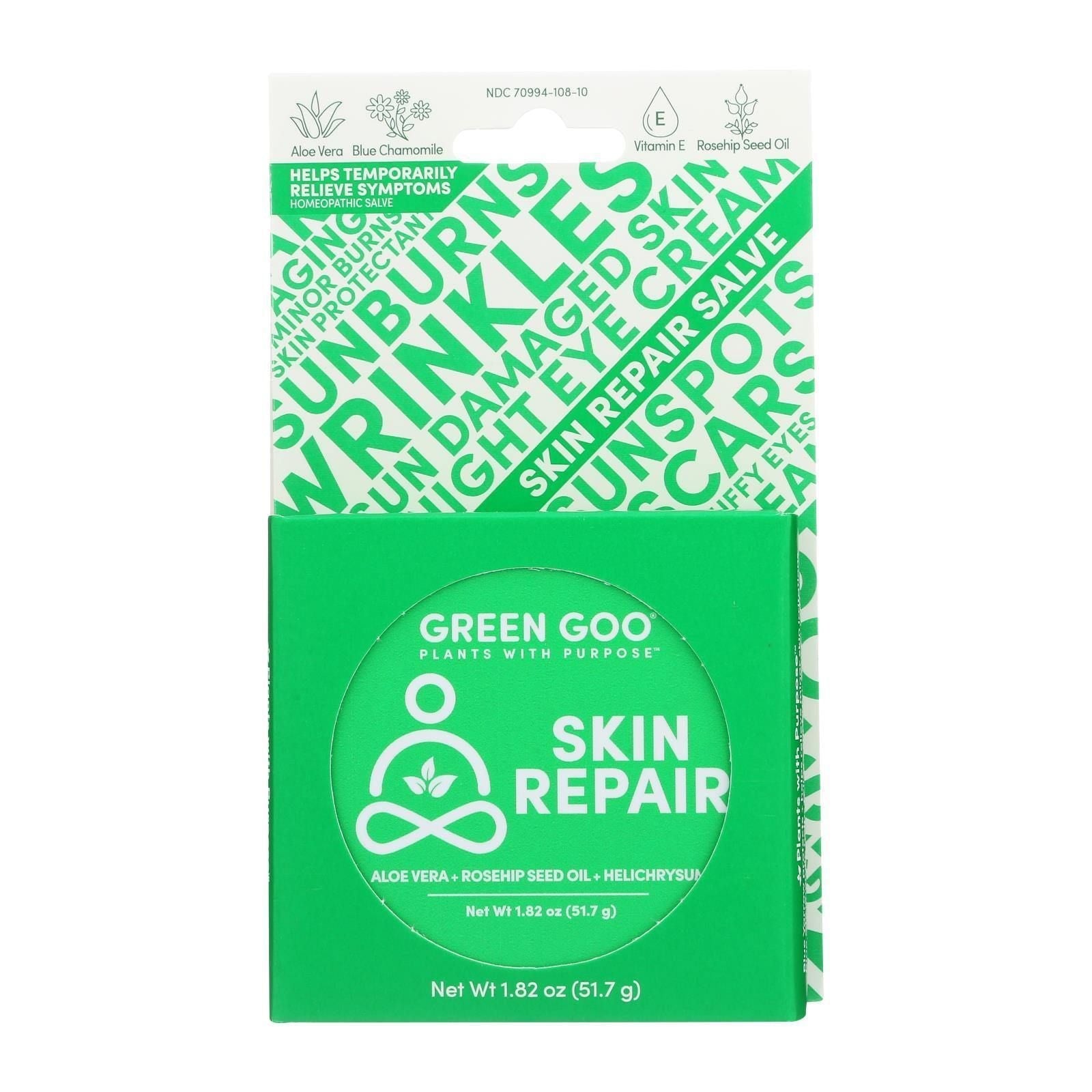 Details:br pGreen Goos Skin Repair nourishes, moisturizes, and improves your skin's appearance with a nutrient-rich blend of aloe vera, vitamin E, coconut oil, and more. It's an essential part of your nightly skin care routine, offers crucial soothing protection after you spend time in the sun, and is exceptional on scars, wrinkles, puffy eyes, dark circles, and minor burns. Power packed with aloe vera, blue chamomile, vitamin e, and rosehip seed oil. Does not contain parabens, phthalates, petrochemicals, or artificial ingredients. Ingredients: ACHILLEA MILLEFOLIUM;YARROW;OIL .19% CHAMOMILLA RECUTITA;MATRICARIA;FLOWER .19% PURPOSE ASTRINGENT ORGANIC ROSA CANINA;ROSE HIP;SEED OIL 3.06% PURPOSE SKIN PROTECTANT;ORGANIC ALOE BARBADENSIS;ALOE VERA;LEAF;ORGANIC HELIANTHUS ANNUUS;SUNFLOWER;SEED OIL;ORGp
