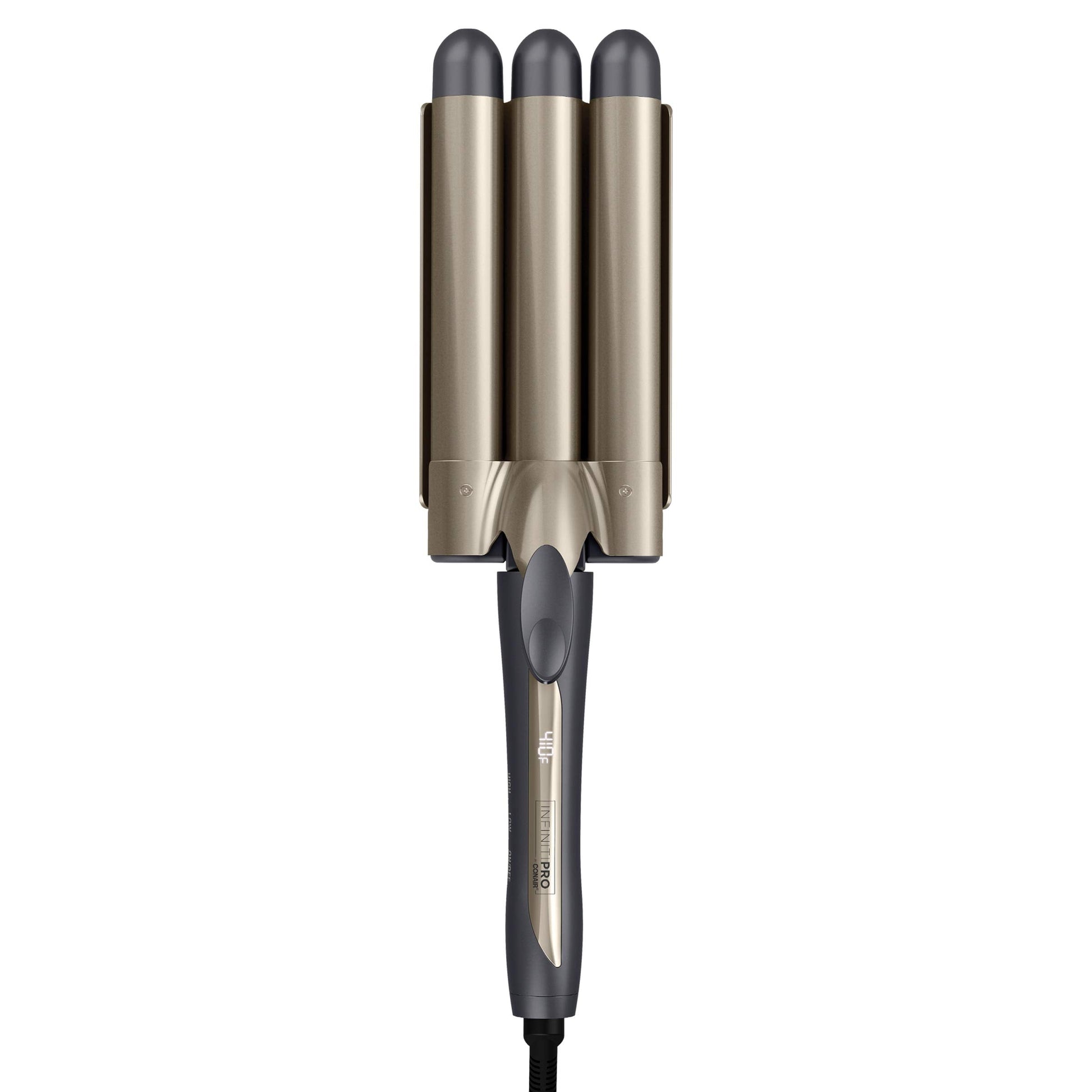 Introducing the new INFINITIPRO BY CONAIR Triple Barrel Waver. This triple barrel waver is designed with large 1'' barrels to create gorgeous, continuous waves. Style your hair your way with 5 heat settings and a maximum temperature of 410F. This waver is designed with 60 second fast heat up, maintains heat level during use and has a no stress auto off feature. The tourmaline ceramic coating reduces frizz and boosts shine for healthy-looking hair. Our Pro tip: for gentle, soft waves use larger pieces of hair each time you style.