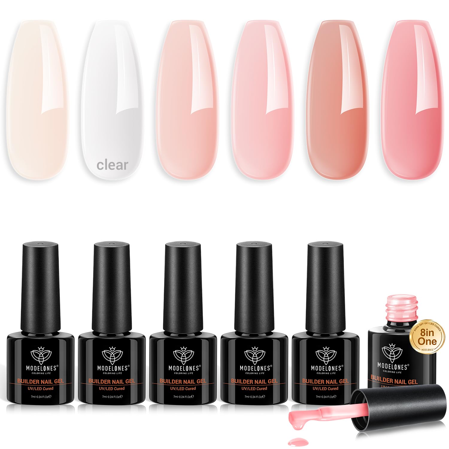 - Limited Edition Pink Builder Nail Gel: 6 Pcs x 7 ml / 0.24 oz All Seasons Modelones gel builder set, inspired by 2025 Most Popular Nail Color. Nude Pink Series is suitable for any holiday, special event and daily routine life, come with elegant pink nude builder nail gel, achieve the best modern salon-looking mani at home for a small fee. Note: Need to be cured under U V / LED lamp for 60-90 s