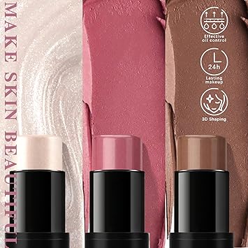 - 【Save Your Makeup Time】Simply apply the contour stick to the edge of your hairline and the sides of your face, apply the blush stick to your cheeks, apply the highlighter to the areas that need highlighting, and blend with your fingers or with a brush to help improve your skin tone and face contour for a natural, glamorous look.