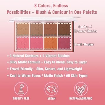 - 8 Colors Blush Bronzer Palette: 8 big size pans in 1 box, include color payoff blush and bronzer, each color can be used individually or mixed to create more colors. It can be used to modify the whole face, such as blush, shading, eyeshadow etc.