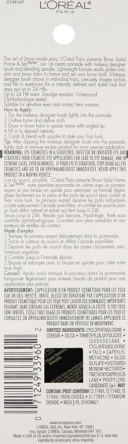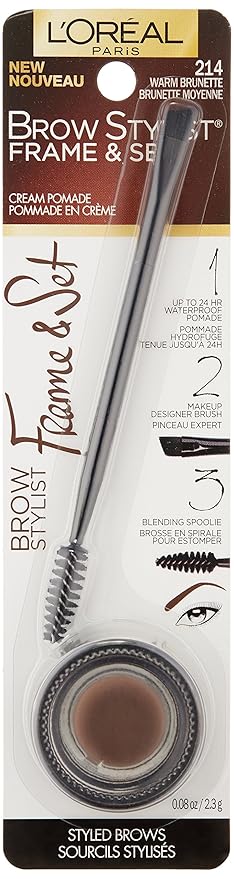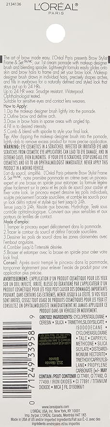L’Oral Paris presents Brow Stylist Frame & Set , our 1st brow pomade with makeup designer brush and blending spoolie. Lightweight formula easily glides onto skin and brow hairs to frame and set your brow makeup look. Makeup designer brush draws in individual hairs, precisely shapes arches, and fills in eyebrows for a naturally defined and styled brow makeup look that stays put up to 24 hours. Tip: After dipping the makeup designer brush into the brow pomade, lightly dab to remove excess product for more precise application. • Up to 24HR waterproof eyebrow pomade • Makeup designer angled brush • Styled brows • Sculpting and Shaping Start with clean, brushed brows. 1. Dip the makeup designer brush lightly into the pomade. 2. Outline brow and define arch. 3. Draw in brow hairs in sparse areas with angled tip. 4. Fill in to desired intensity. 5. Comb & blend with spoolie to style your final look. Warning: Eye cosmetics in a scratched, infected or irritated eye and scratches from cosmetic eye applicators can lead to eye damage, and in extreme cases, even blindness. If your eye is scratched, stop using all eye cosmetics and go to an ophthalmologist immediately. Never apply this product in a moving vehicle.