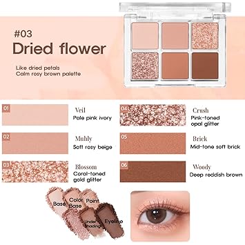 - [PERFECT DAILY MAKE UP COLORS] It is an excellent eye palette for daily makeup with a combination of basic colors that are not too flashy, colors that can be used for point shading, and glitters and pearls that maintain the Vaseline shine all day long.