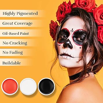 - Red Black White Face Paint - This super smooth cream covers efficiently without dryness or cracking. It is the first choice of professional long-lasting foundation for various Fx makeup. Using red, black and white face paint, is especially suitable for making makeup for clown, joker, vampire, zombie, skeleton face, spiderweb and ghostly look.