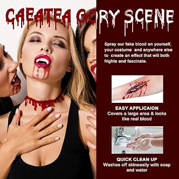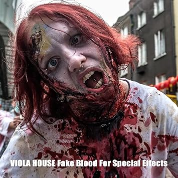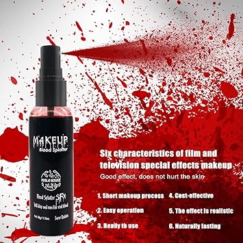 - 【Safe Ingredients Fake Blood Red Spray】VIOLA HOUSE Fake Blood is made of non-toxic material, skin-friendly, non-irritating, cruelty-free, can be applied directly to the skin. With all cosmetics we recommend that a small skin patch test be performed prior to application as every skin is different. Be careful when applying around the eyes and mouth, not in the eyes or mouth.