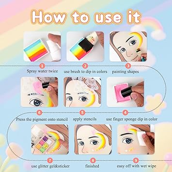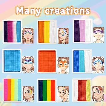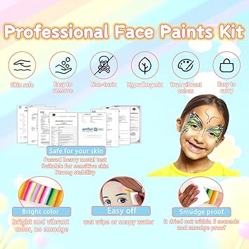 - [EASY TO USE AND WASH OFF] This kit comes with water based pigment. Bright facepaints are easy to apply smoothly and dries fast to give great coverage. The high-quality formula ensures that vibrant colors easy to apply and won't fade or smudge. When the fun is over, the washable face paint effortlessly comes off with mild soap and water or wet wipes.
