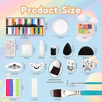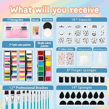 - [COMPLATE FACE PAINT KIT]depvision super value pack can meet all your needs. Professional split cakes can be easily activated with minimal water. One Stroke Cakes can be picked up in easy brush strokes to create colorful designs. The sponges, stencils, glitter, folding bucket and springking can meet all your needs. You can keep all of the in storage box for the next time. You do not need to buy another items for painting. So it is suitable for face paint starter or professional face painter.