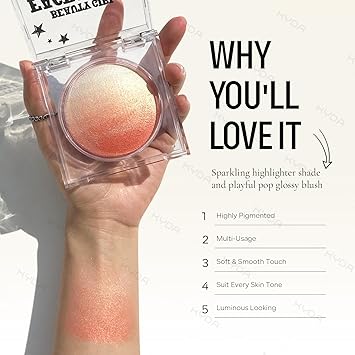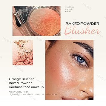 - 【Super Glossy Baked Powder】Sparkling highlighter shade & playful pop glossy blush shade in one baked powder makeup, rich in color and highly buildable, three tone: pink, coral and orange, which can suit every skin tone to build and accentuate facial features.