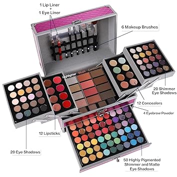 - The 132 Color Makeup Box: Includes 94 colorful eye shadows, 12 lip glosses, 12 concealers, 5 eyebrow powders, 3 face powders, 3 blushes, 3 contour shades, 2 Lip Liners, 2 Eye Liners, 4 Eyeshadow Brushes, and 1 Mirror.