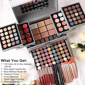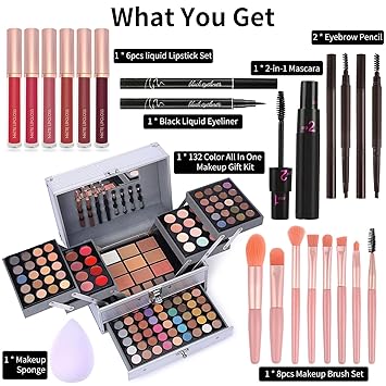 - All-in-one Makeup Kit: In this comprehensive set, you will get a 132-color makeup case, a 6-pack lip gloss set, a makeup brush set, grey and brown eyebrow pencils, 2-in-1 mascara, 1 black liquid eyeliner pen, and 1 makeup sponge. It includes everything you need to create stunning looks for women, teens, and girls, whether you're a beginner or a pro.