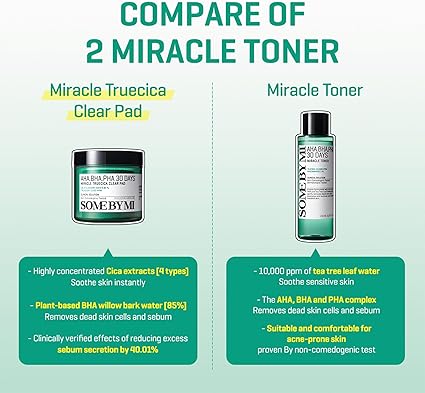 - MIRACLE TONER PAD : The Korean toner pads help to refine skin texture in the first step of skincare, ensuring a smooth base for makeup application. These AHA BHA toner pads are particularly effective due to their inclusion of AHA/BHA/PHA ingredients, which gently exfoliate dead skin cells and impurities, leaving the skin clear and smooth. Additionally, the Truecica complex in these pore care toner pads calms and soothes irritated skin, making them an essential part of any Korean skincare routine