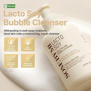 - LACTO SOY BUBBLE CLEANSER : Lacto Soy Bubble Cleanser offers a gentle 3-second exfoliation, where lactic acid-rich Lacto Soy creates fine bubbles that effortlessly dissolve dead skin cells, improving texture for a smoother complexion without harsh friction. With daily use, the low-irritation konjac beads helps soften and remove dead skin cells. Additionally, hydrating ingredients like glycerin, betaine, and glucose help maintain moisture balance and refreshed even after cleansing