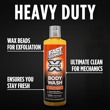 Introducing Fast Orange Grease X Body Wash, the ultimate solution for men who tackle tough jobs and need a body wash that works as hard as they do. Specifically formulated with mechanics in mind, this heavy-duty body wash goes beyond the basics to remove stubborn grease, grime, and oil while also eliminating the strongest automotive odors like fuel, oil, and exhaust. Infused with wax beads, it exfoliates the skin, effortlessly scrubbing away even the toughest dirt. Yet, despite its powerful cleaning abilities, Fast Orange is gentle enough to be used all over, leaving your skin feeling refreshed and moisturized. Ideal for men’s hygiene and self-care, this perfumed moisturizing body wash not only cleans but also leaves you smelling great, making it the perfect addition to your grooming routine. Whether you need to groom and clean after a long day in the garage or simply want a bath gel that can handle strong body odors, Fast Orange Grease X Body Wash is the go-to choice for men who demand more from their bodywash.