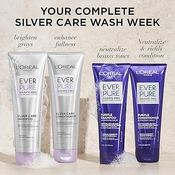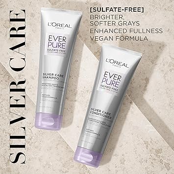 Get brighter, silkier and healthier-looking gray and silver hair with EverPure Silver Care Sulfate Free Shampoo & Conditioner. Formulated with Peptides, our silver hair care regimen leaves hair feeling nourished, strong and voluminous. Our gentle and non-stripping hair care formula is suitable for natural and color-treated hair. For best use, lather shampoo into wet hair and leave in up to 2 minutes. Rinse. Follow with EverPure Silver Care Conditioner. For extra toning power, use EverPure Purple Shampoo and Conditioner 1-3x per week to fight brass and yellow tones. EverPure Hair Care is always vegan, color-caring & powered by science. L'Oreal Paris is a total beauty care company that combines the latest in technology with the highest in quality for the ultimate in hair color, hair care, hair style, skin care and cosmetics. This product features no animal-derived ingredients or by-products and is made in a facility that also processes gluten.