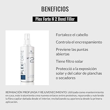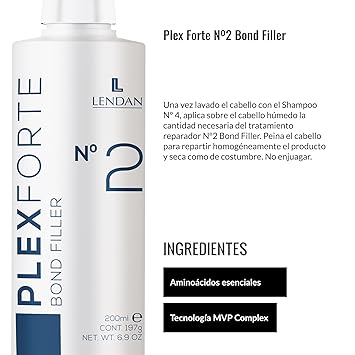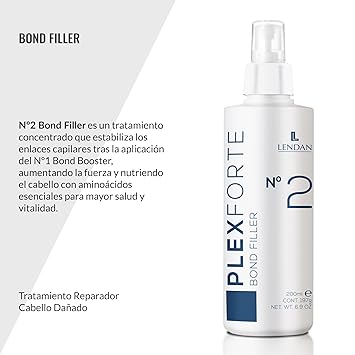 The PlexForte Nº2 Bond Filler Repair Treatment is a concentrated product designed to stabilize hair bonds after the application of Nº1 Bond Booster. Its formula is enriched with essential amino acids that nourish the hair and increase its strength, providing deep repair and rejuvenation from within. When used as part of at-home maintenance, this treatment helps create new protein bonds, repairing damaged hair fibers and revitalizing their appearance from the first application. Additionally, the MVP Complex technology present in this treatment strengthens the hair, controls frizz, and prevents split ends. It also includes a UV filter and thermal protection, shielding the hair from damage caused by sun exposure and heat tools like flat irons or blow dryers. The application is simple: after washing the hair with Shampoo Nº 4 Plex Forte, apply an adequate amount of the Nº2 Bond Filler treatment to damp hair. Then, comb to distribute the product evenly and dry as usual, no rinsing required. At Lendan Cosmetics, we have over 50 years of experience in the hairdressing and beauty sector. We prioritize research and the development of innovative formulas to offer the best results in hairdressing products.