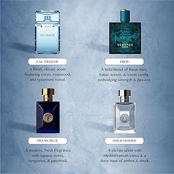 Versace Cologne for Men Set of 4 Mini Eros, Pour Homme, Dylan Blue, Eau Fraiche Perfume Fragrance Sampler - Designer Mens Samples (4 Count, 0.17 oz)