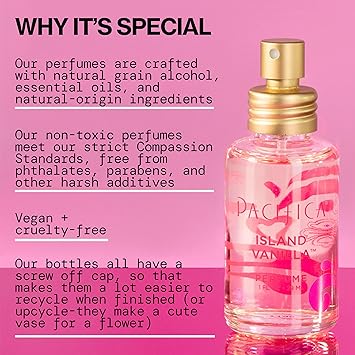 Clean, Vegan & Cruelty-Free Beauty: Pacifica is a leader in clean beauty, and Island Vanilla is no exception. This perfume is proudly 100% vegan and cruelty-free - no animal-derived ingredients and never tested on animals. The formula is free of harsh chemicals: no parabens, phthalates, or sulfates ever. Instead, we use a corn-based natural alcohol and infuse it with our signature blend of natural and essential oils to create a luxe fragrance that’s kinder to your skin. You can spritz freely knowing you’re applying a non-toxic perfume that meets strict clean standards. It’s safe for most sensitive skin. Clean beauty devotees can wear this scent with pride and peace of mind!