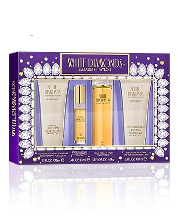 Immerse yourself in the delightful scent of White Diamonds perfume whenever you want to feel irresistible. Truly feminine and captivating, this classic fragrance was launched in 1991 by the famous actress Elizabeth Taylor for the woman who delights in luxury. Alluring notes of aldehydes, neroli and Amazon lily open this flowery, provocative scent making way for the aura of tuberose and warmer elements of amber, patchouli and sandalwood to create an exciting scent that is perfect for a romantic evening out. This Elizabeth Taylor White Diamonds Gift Set Includes: 3.3oz Toilette Spray Naturel, 3.3oz Perfumed Body Lotion, 3.3oz Gentle Moisturizing Body Wash & .33oz Eau de Toilette Spray
