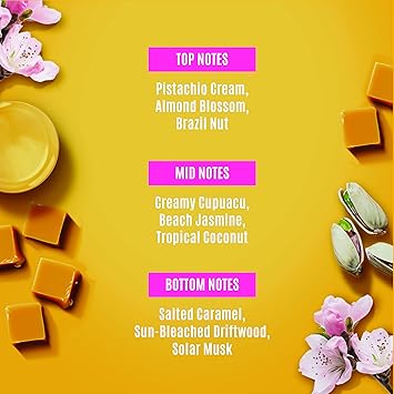 - Deliciously Sweet and Warm Brazilian Nut Scent: The fragrance opens with a vibrant burst of Pistachio Cream, Almond Blossom, and Brazil Nut, followed by heart notes of Creamy Cupuaçu, Beach Jasmine, and Tropical Coconut. The base notes of Salted Caramel, Sun-Bleached Driftwood, and Solar Musk create a lingering, sweet memory of summer vacation, making it an irresistible scent journey.