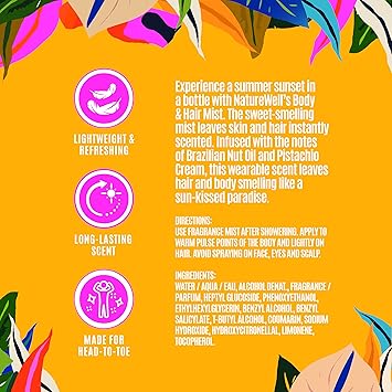 - A Long-Lasting Fragrance: NatureWell’s Body & Hair Mist features the signature Cheeky fragrance, offering a delightful blend of warm, sweet, and creamy notes. Its lightweight formula ensures that your body and hair stay freshly scented, providing a continuous essence of a tropical escape.