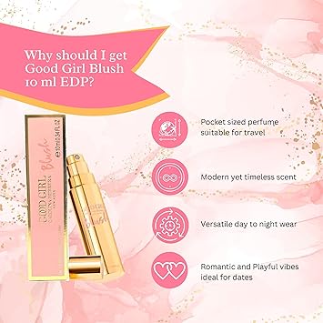 Good Girl Blush is a floral-fruity fragrance that exudes charm and elegance. It opens with refreshing citrus notes that mingle with juicy fruits, creating a bright and inviting introduction. At its heart, delicate floral notes blossom, including soft rose petals and jasmine, adding a romantic and feminine touch to the composition. The base notes offer a warm and comforting finish, featuring creamy tonka bean and subtle woody accords. These elements provide depth and longevity to the fragrance.