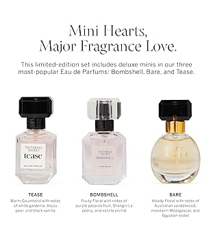 - Mini hearts, major fragrance love. This limited-edition set includes deluxe minis in our three most-popular Eau de Parfums: Bombshell, Bare, and Tease