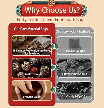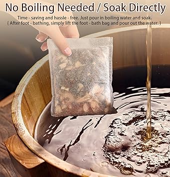 - Usage : Soak in boiling water above 90°C for 5 minutes and wait for the water temperature to cool down to 45°C,15-30 minutes each time,it 3 to 5 times per week,Use as foot soak or full body bath as you like or for your convenience,Put the bag directly into the water when using it.The natural ingredients will work their effect, helping to relieve stress, reduce fatigue, and promote overall well-being.