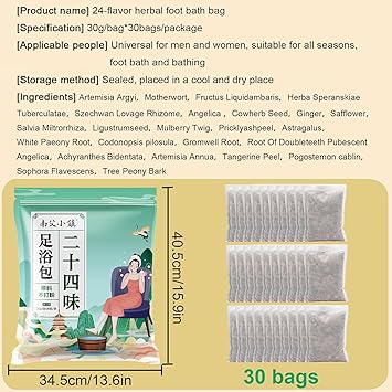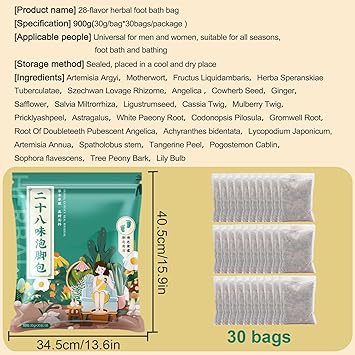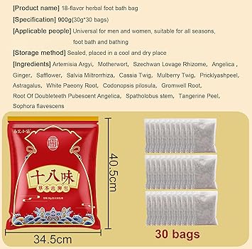 - Independent Packaging : 30 packet/box, total 31.8oz(900g) herbal foot bath,30g*30packet. Share the joy of Chinese medicine with family or friends.