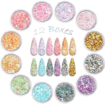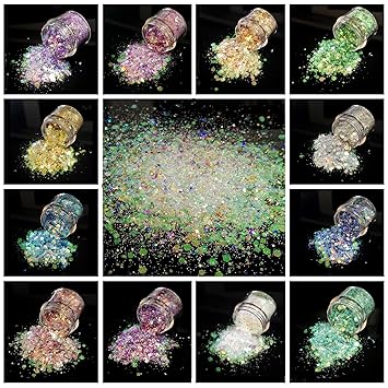 Allstarry 12 Colors Mermaid Nail Chunky Glitter Ultra-Thin Fluorescent Glass Paper Irregular Iridescent Sequin Flakes Glitters Sticker for Nails Art Decoration Hair Eyes Face Body DIY Craft