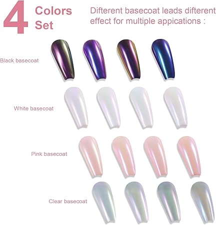 - Amazing Chameleon Effect: The white chrome nail powder is loose and ultra fine, it creates two different colors, giving the nails a chameleon color and chrome effect. And different basecoats lead different effects. The pearl chrome nail powder is suitable for DIY nails with ice effects, mermaid/shell effects, or unicorn effects.