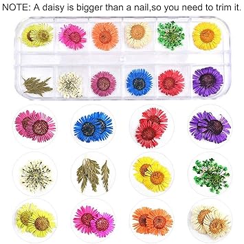 - 【Package Include】 - 3 Boxes / 78 pcs different colors and different style nail dried flower set. Starry dried flowers, five flowers, daisies, leaf, with a pick up tweezer.