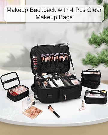 Relavel Makeup Backpack, Professional Case Extra Large Travel Train Bag for Women Cosmetic Organizer, Brush Storage Holder, Artist Kit, with Adjustable High Dividers
