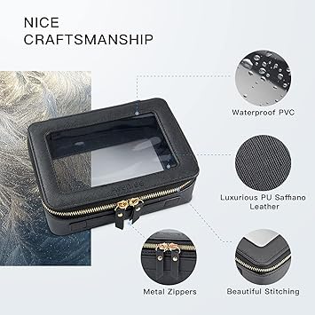 - 【LUXURY DESIGN】Measuring 7.9” x 5.7” x 2.7”(20 cm x14.5cm x 7cm), our makeup bag is leek and stylish, this makeup travel organizer was designed in a minimalist boxy shape and a cool black color. Crafted in beautiful PU leather and finished with polished hardware, it's the clear pouch you'd be happy with sitting out on display beside you.