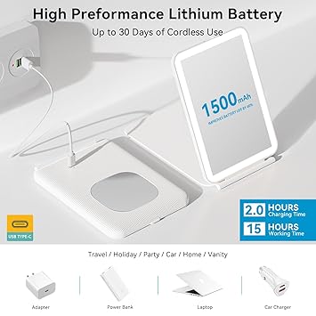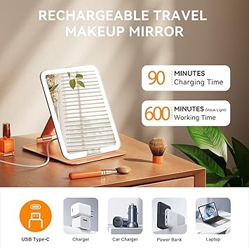 - USB RECHARGEABLE: The travel makeup mirror supported by a 850mAh lithium battery; great for on-the-go useno need for batteries, charge via USB Type-C cable(INCLUDED) in a socket, PC, power bank or car; automatic shut-off after 15 mins without operation