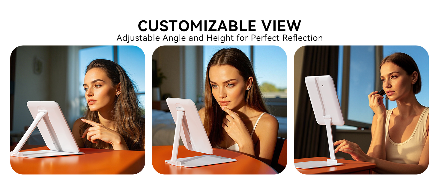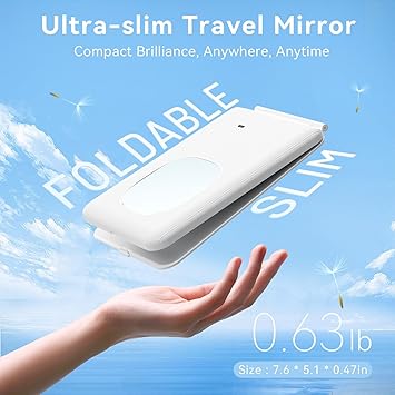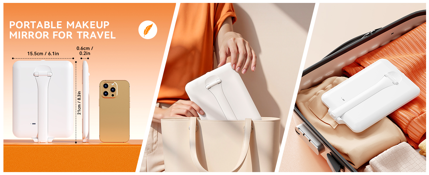 - TRAVEL SIZE LIGHTED MIRROR: Ultra-light and ultra-thin, this portable travel mirror with lights is 7.4*5.1in, 0.6lb, just an iPad Mini Size, it fits easily into your handbag, cosmetic bag, or travel suitcase; you can adjust the angle for the best view with its 180° rotation feature