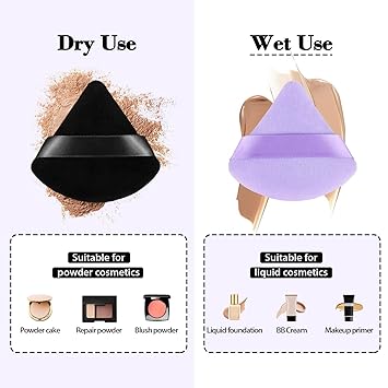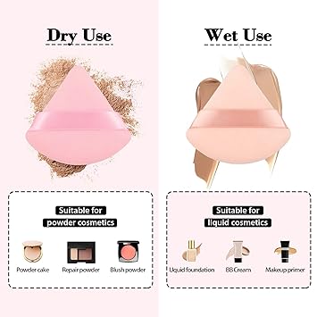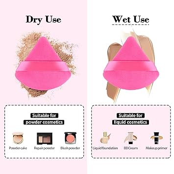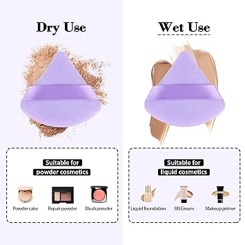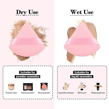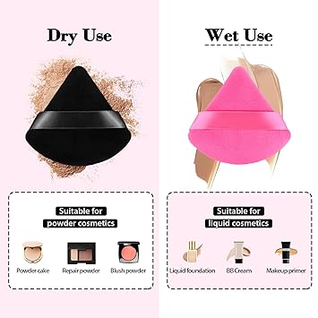 - ️Different usage: our triangular shape puff is suitable for dry and wet cosmetics, such as foundation, blush, loose powder, powder, body powder, concealer, and so on. It is easy to smear on the nose or eyes, and it can fine dress your makeup.