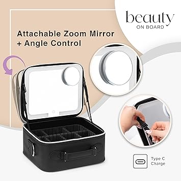 Travel Makeup Bag with LED Mirror, PU Leather Case - 3 Adjustable Brightness Levels, Lighted Cosmetic Dividers Make Up Portable Storage Organizer Handle