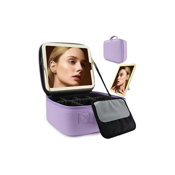 Travel Makeup Bag for Women and Artists Cosmetic Organizer Large Case,Travel with Mirror 3 Color Setting,Portable Storage Adjustable Dividers Bag(Purple)