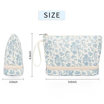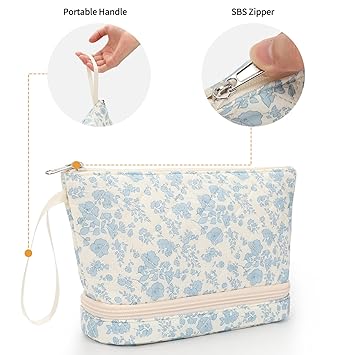 Ethereal Small Makeup Bag, 2 Layers Travel Make up Organizer Bag with Brush Holder, Portable Cosmetic for Women/Girls, Blue Flower