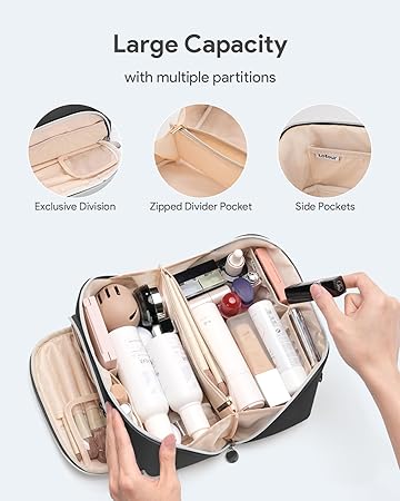 - Large Capacity: Unfolds nearly 180° flat for easy access to cosmetics, toiletries, and other travel essentials. The spacious main compartment includes 4 internal pockets and a zippered divider, making it easy to neatly store lotions, eyeliners, mascaras, lip gloss, and more.
