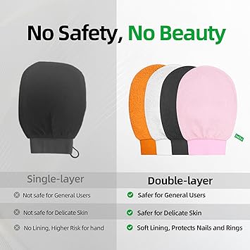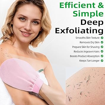 - Self-Tan Prep/Remover: Use these gloves before and after applying your self-tanner for an even, long-lasting tan without dark spots. Efficient exfoliation removes old tans and prepares a smooth base. Perfect for prepping and removing self-tanners.