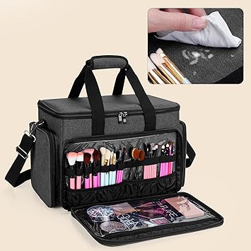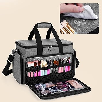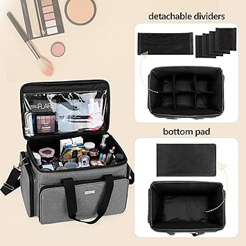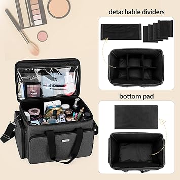 - ADJUSTABLE COMPARTMENTS - The main compartment (with a bottom pad and 5 adjustable dividers) holds a lot of cosmetics of all sizes. Note: This section is deep enough to keep makeup and skin care products in an upright position. Interior height measures 10'.