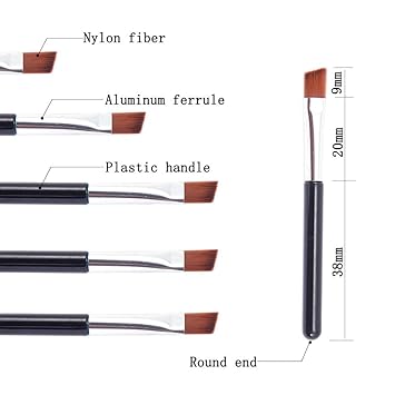 - Color and Size: sliver/black aluminum ferrule+black plastic handle+Brown/black nylon fiber. Size(approx.): Total length:65mm x diamder 5.0mm.Expose length of brush 9.0mm(long side) x 7.0mm(short side)