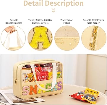 eurovicky Chenille Letter Patch Clear Makeup Bag, Preppy PVC&Nylon Bag with Handle and Zipper, Waterproof Large Travel Toiletry Storage for Women