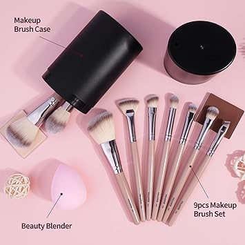 - MAANGE MAKEUP BRUSH SET: Contains 9 basic makeup brushes for eyeshadow, blush, powder etc. 1 makeup sponge and 1 black case. A complete set of makeup equipment to create a flawless natural look, save the worry and effort, and Let each makeup brush give full play to its effect and not be left unused.