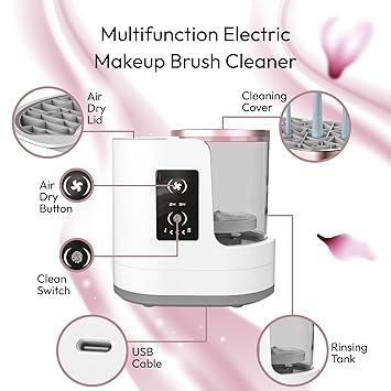 This Electric Makeup Brush Cleaner and Dryer offers hands-free drying with 2-hour and 5-hour timer settings, preserving brush shape and preventing dust buildup.